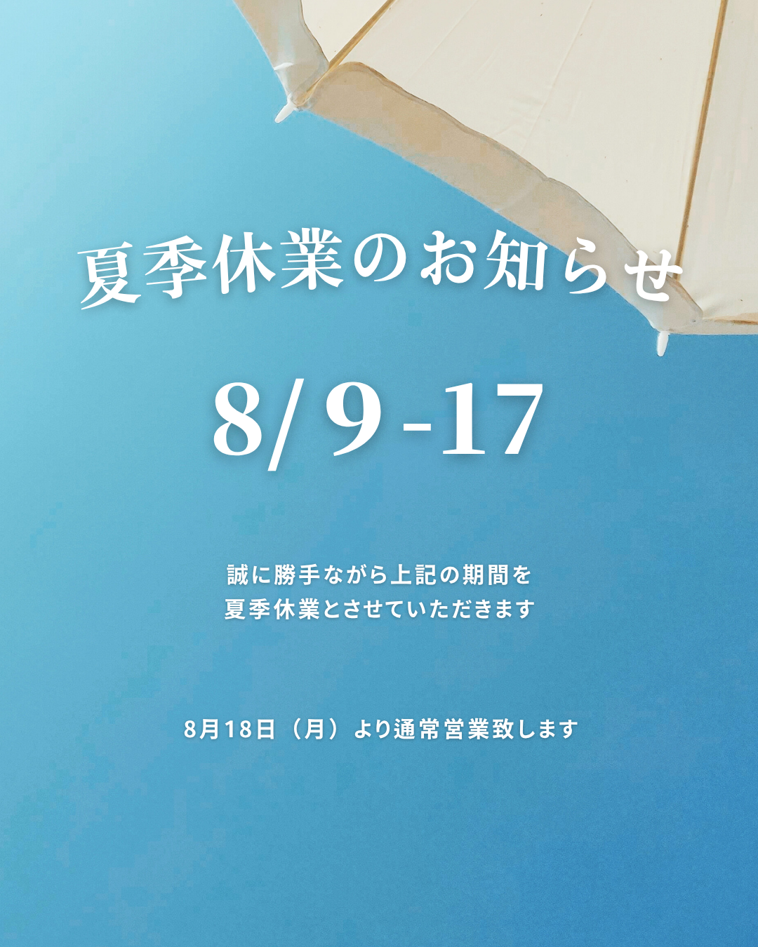 8/9(土)~8/17(日) を夏季休業とさせて頂きます。
