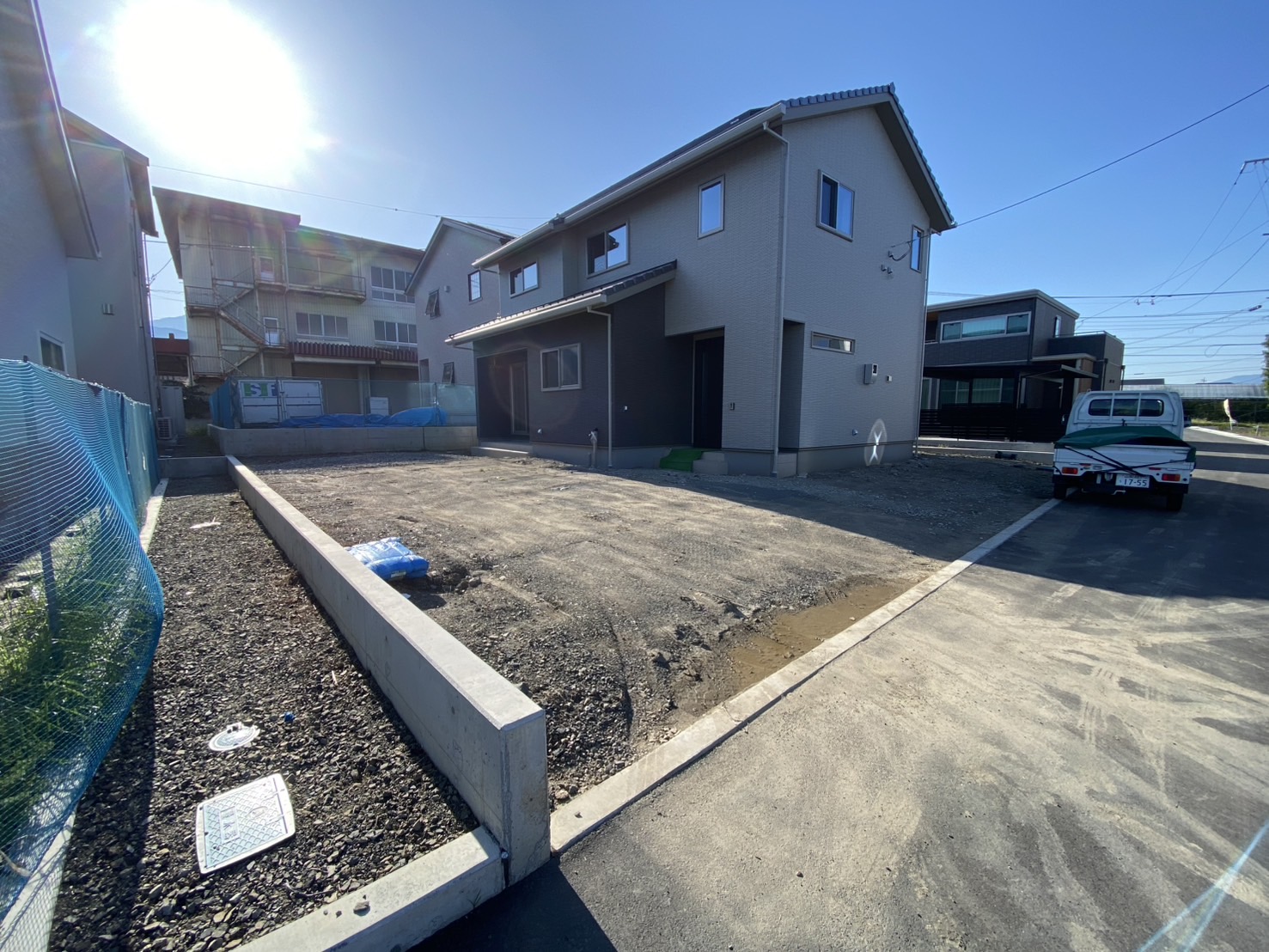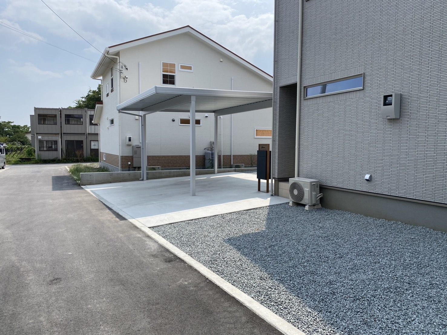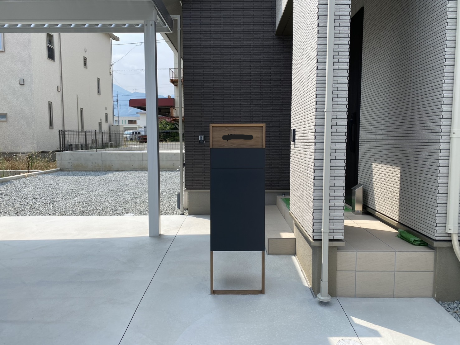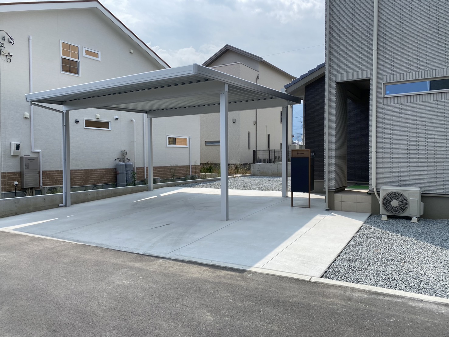 施工実績WORKS 2025.08.27 トータルエクステリア カーポート・ガレージ 土間コンクリート・透水性コンクリート 南アルプス市 K様邸 外構工事 OUTLINE仕様 コンセプト 駐車場の整備と防草対策の工事をおこないました 雑草が生えないように、土間コンクリートはカッター目地を採用 折版屋根の2台用カーポートは積雪強度50㎝対応品 広々と駐車可能です! 宅配BOXユニットは便利で、今時は欠かせないアイテムですね