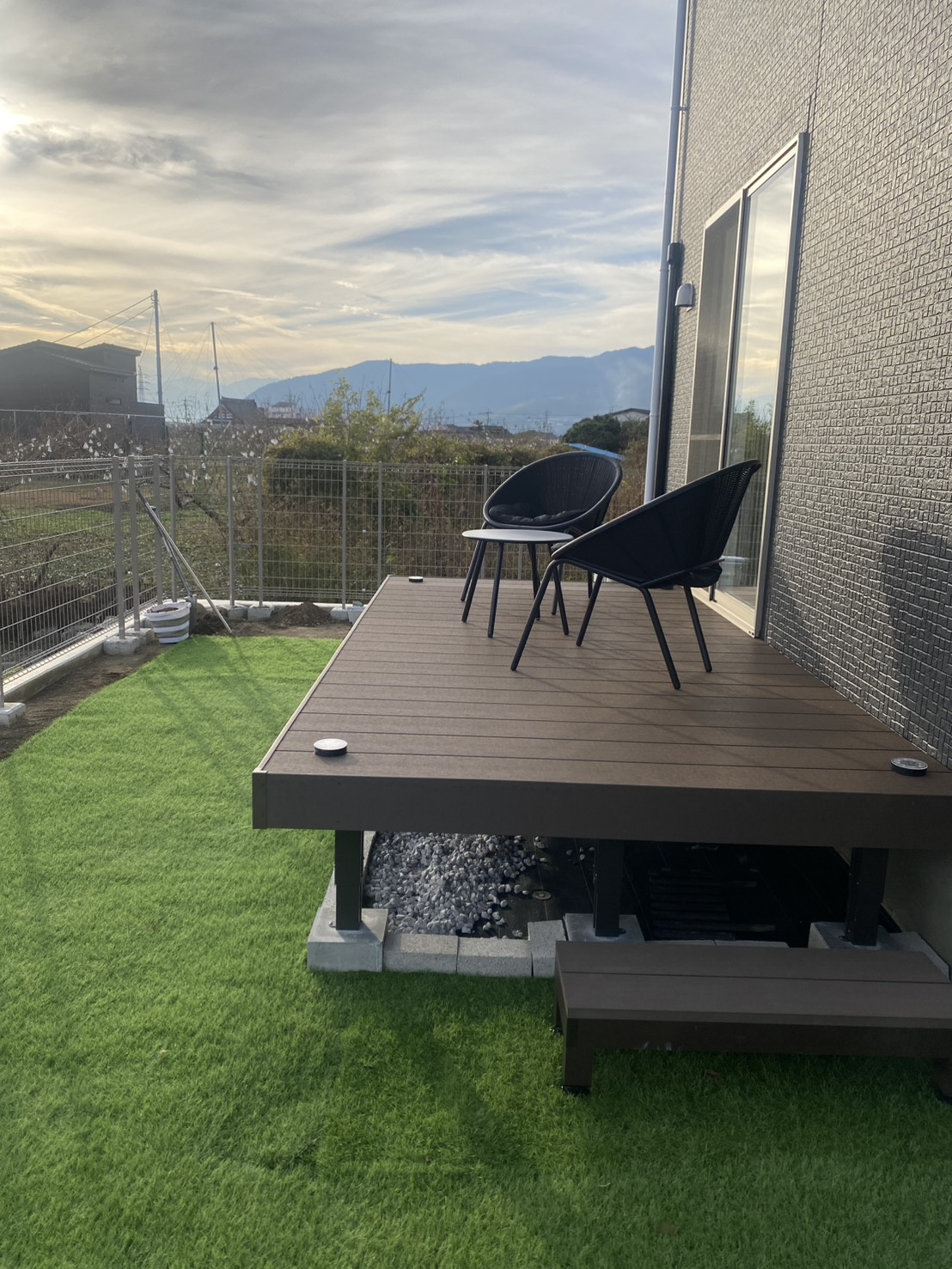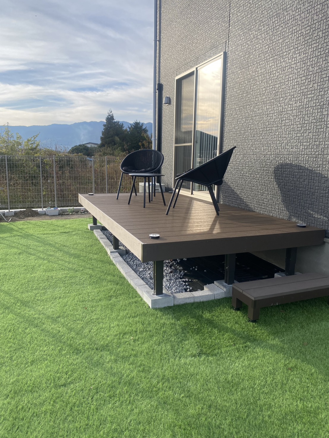 施工実績WORKS 2025.12.16 植栽 テラス屋根・デッキ H様邸 デッキ工事 植栽工事 OUTLINE仕様 コンセプト デッキの取付と植栽(お施主様支給品)工事をおこないました デッキ周りの人工芝は、後日お施主様が取付されました 植栽部分は、舗装をカットして、土の入替もおこなっております デッキの色が住宅とあっていてとても素敵です